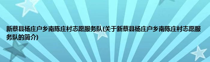 1、 新蔡县杨庄户乡南陈庄村志愿服务队是由新蔡县志愿服务联合会领导下的志愿团体。
